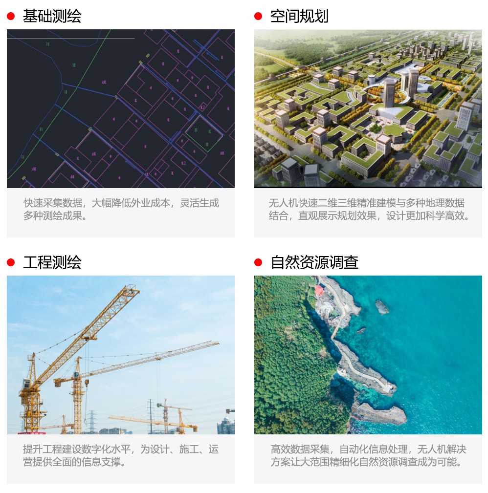 基礎(chǔ)測(cè)繪,空間規(guī)劃,工程測(cè)繪,自然資源調(diào)查等。