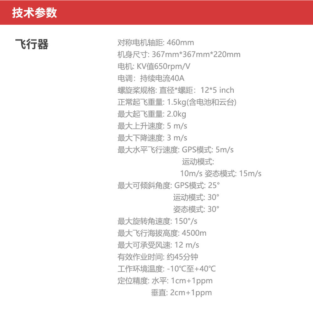 10、懸停精度 :?jiǎn)⒂肦TK且RTK正常工作時(shí): 垂直:±0.1m;水平:±0.1m 垂直:±0.1m(視覺定位正常工作時(shí)), ±0.5m(GNSS定位正常工作時(shí))