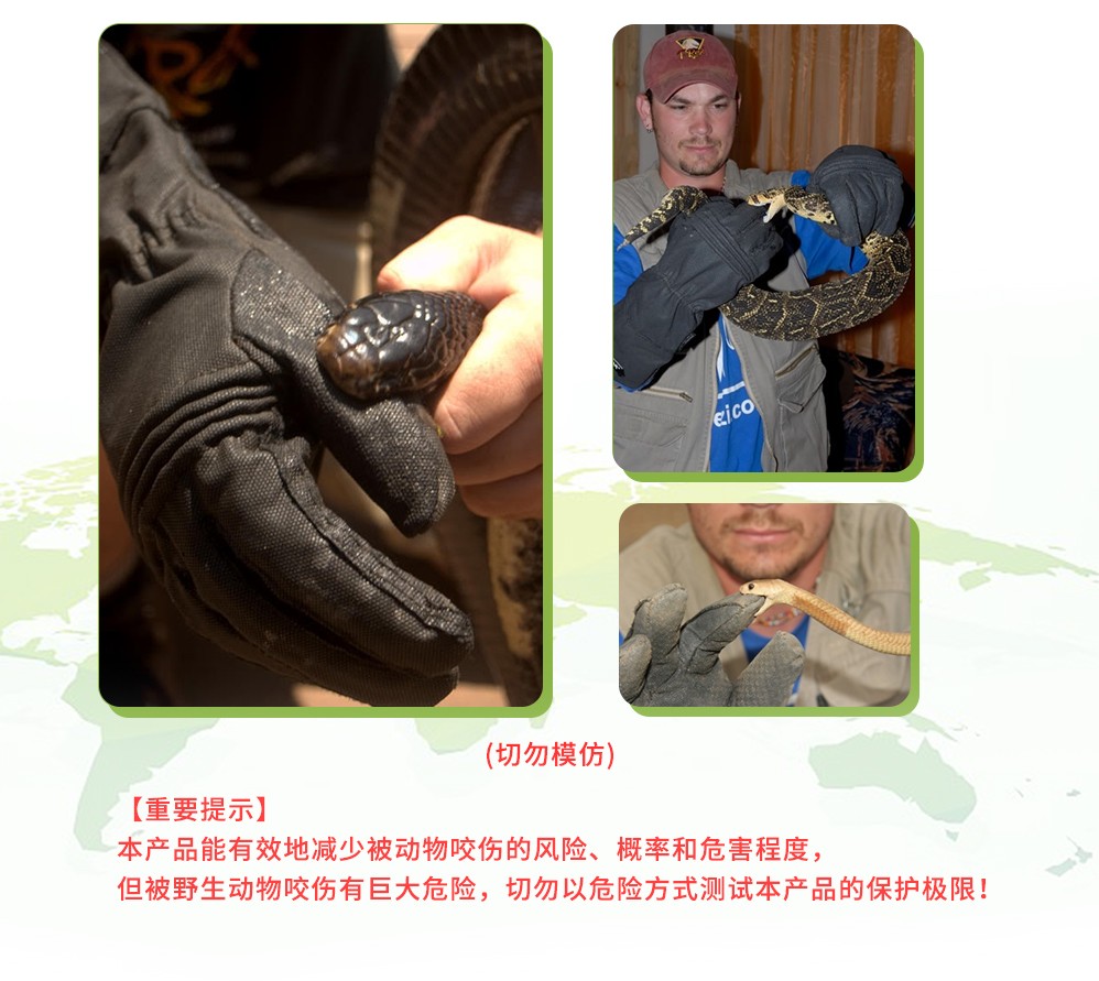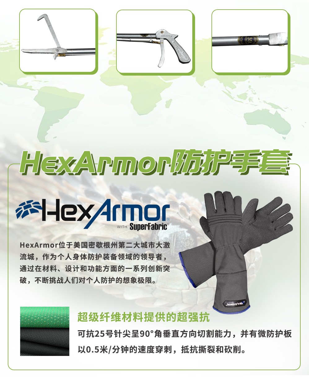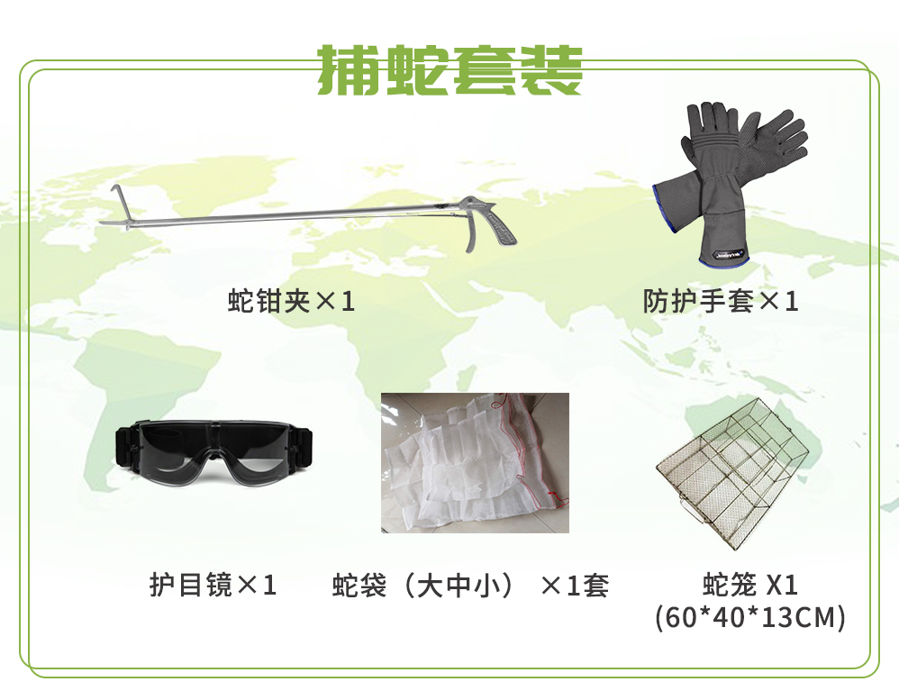 捕蛇桿: 通身采用持久耐用的強(qiáng)化鋁合金材料,輕便和堅(jiān)固,能水平承受住1.5噸的壓力 首尾都采用最古老的砂鑄工藝,使得兩端的摩擦力最大 優(yōu)化的細(xì)部設(shè)計(jì),更細(xì)致的人工打磨,提高人員的舒適度和減輕獵物因夾力大而受傷的幾率 牽引力傳動(dòng)裝置,外置一根鍍鉻一體螺紋鋼絲,堅(jiān)韌抗拉性強(qiáng),配合一根高強(qiáng)度的缽金彈簧,彈力穩(wěn)定 手套: 可抗25號(hào)針尖呈90°角垂直方向切割能力,并有微防護(hù)板以0.5米/分鐘的速度穿刺,抵抗撕裂和砍削。